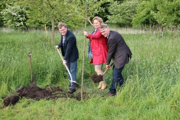 Gemeinsam mit Vertretern der Gemeinde pflanzten der CDU-Kreisvorsitzende und Bundestagsabgeordnete Johann Wadephul, Landtagsabgeordneter Hans Hinrich Neve und Kreistagsabgeordnete Beate Nielsen den Apfelbaum der Sorte Elstar auf der Streuobstwiese in Haßmoor.